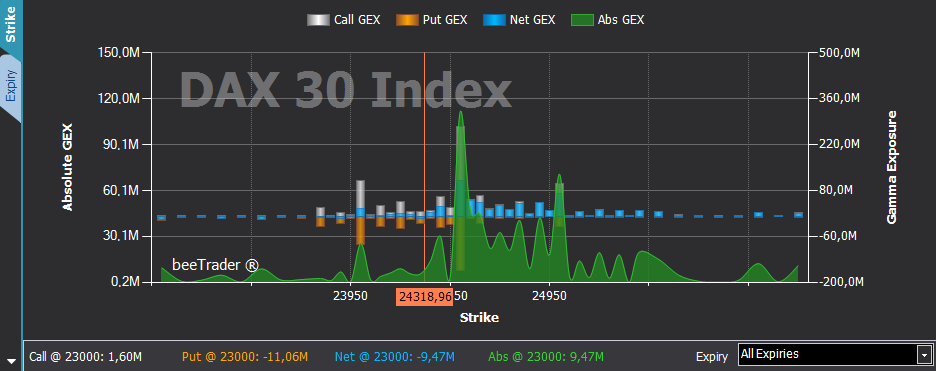 La scheda Gamma Exposure visualizza la distribuzione del Gamma Exposure raggruppata per strike oppure per scadenza.