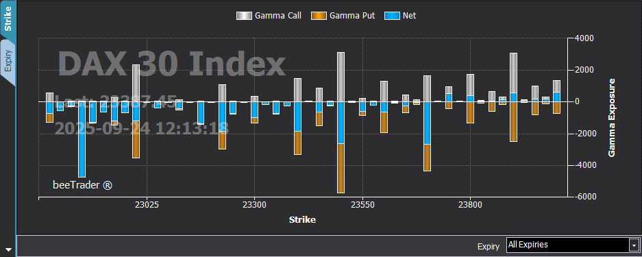 La scheda Gamma Exposure visualizza la distribuzione del Gamma Exposure raggruppata per strike oppure per scadenza.